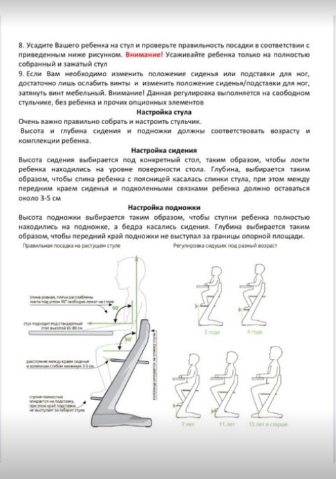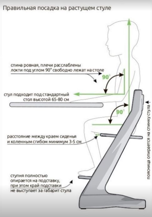 Для того, чтобы правильно настроить растущий стул, необходимо в первую очередь выбрать правильную высоту сидения. Это делается таким образом, чтобы ребенок, положив руки на стол в локтевом сгибе имел угол 90 градусов.